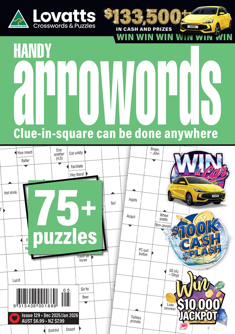 These crosswords are created in the popular clue-in-square style. The clues are in the black squares so these puzzles are perfect to take on a trip or carry in your bag for those spare moments in the day. Each issue of Handy Arrowords also includes arrowords themed around entertainment or general knowledge and every puzzle is doable and lots of fun.